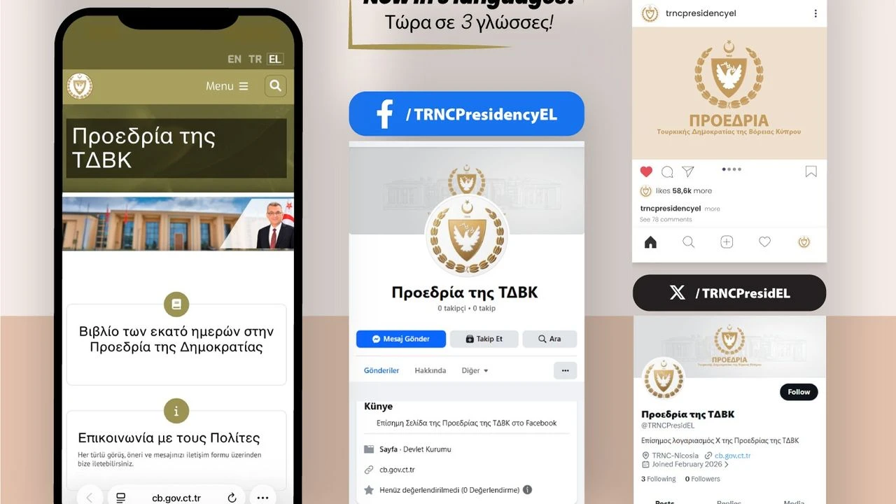 Kuzey Kıbrıs Türk Cumhuriyeti Cumhurbaşkanlığı, resmi internet sitesine Türkçe ve İngilizce’nin ardından Yunanca dil seçeneğini de ekleyerek çok dilli yayıncılıkta yeni bir adım attı. Kurumun sosyal medya platformlarında da Yunanca hesaplar devreye alınırken, ilk Yunanca haber servisi kamuoyuyla paylaşıldı.