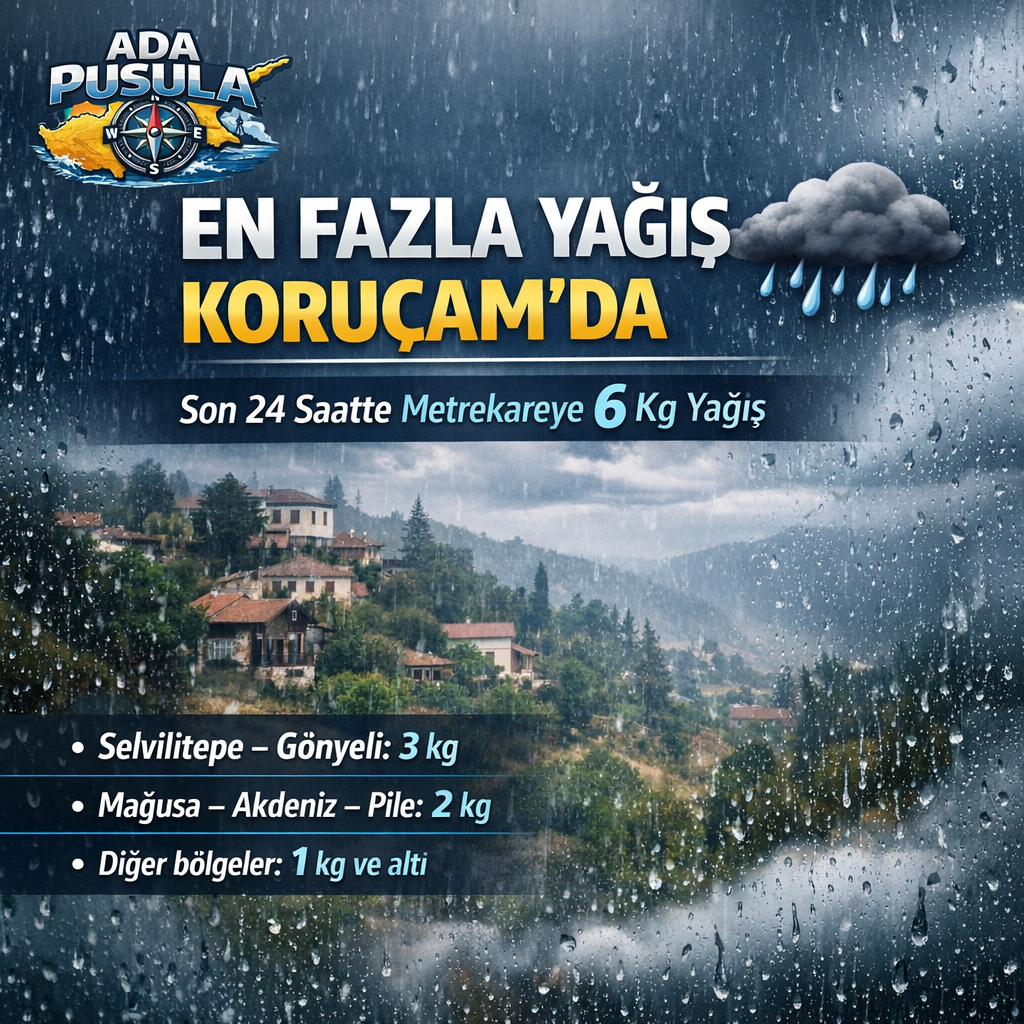 Meteoroloji Dairesi, son 24 saatte en yüksek yağışın Koruçam’da ölçüldüğünü açıkladı. Koruçam’da metrekareye 6 kilogram yağış düşerken, Selvilitepe ve Gönyeli’de 3 kilogram, Mağusa ve Akdeniz’de ise 2 kilogram yağış kaydedildi.