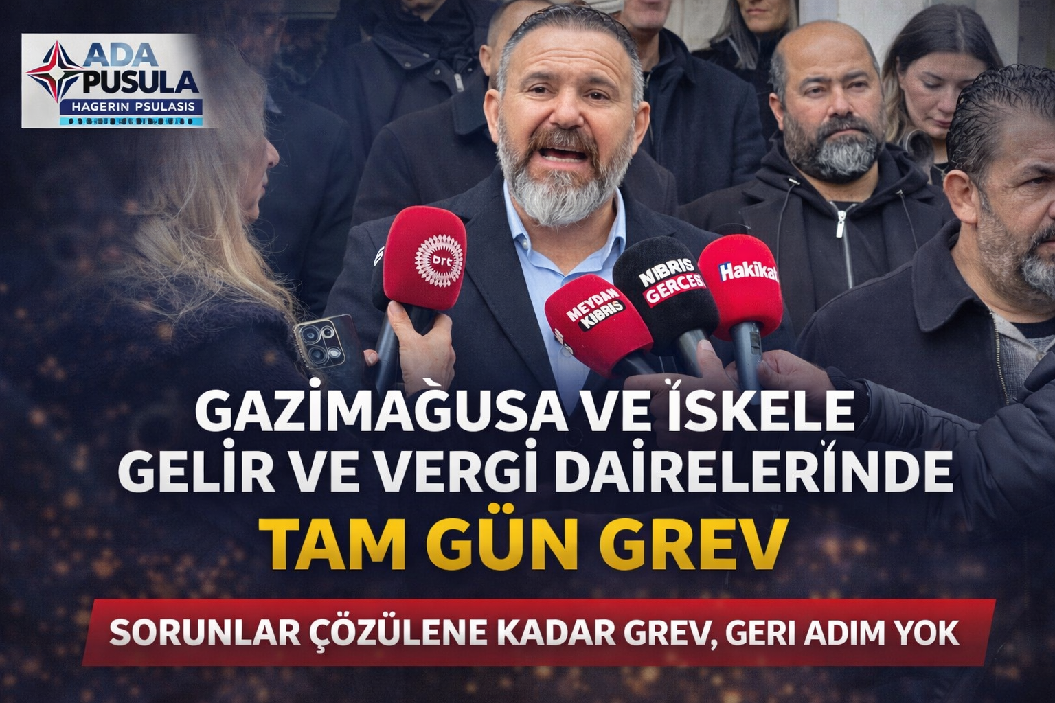 Kıbrıs Türk Kamu Görevlileri Sendikası (KAMUSEN), Kıbrıs Türk Amme Memurları Sendikası (KTAMS) ve Kıbrıs Türk Kamu İşçileri Sendikası (KAMU-İŞ), personel eksikliği, yapısal sorunlar, altyapı yetersizlikleri ve bina işlevselliğine ilişkin sorunlar gerekçesiyle Gazimağusa ile İskele Gelir ve Vergi Dairelerinde bugün tam gün greve gitti.