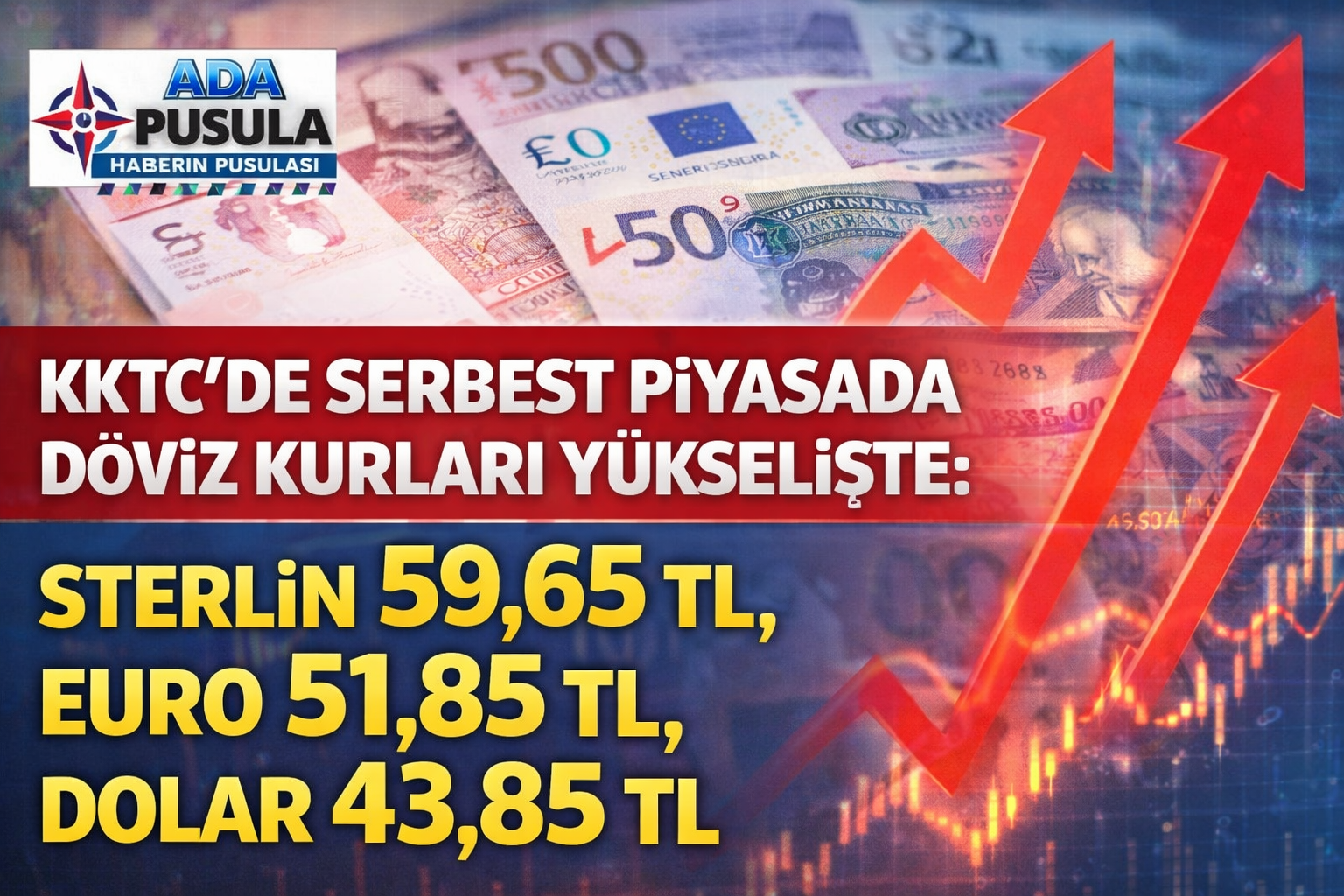 Kuzey Kıbrıs Türk Cumhuriyeti’nde (KKTC) serbest piyasada döviz kurları yeni güne yükseliş eğilimiyle başladı. Sabah saat 09.22 itibarıyla sterlin 59,65 TL, euro 51,85 TL ve dolar 43,85 TL seviyelerinden işlem görüyor.