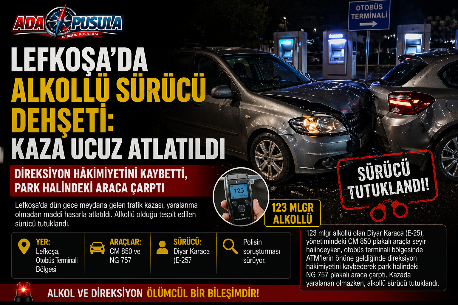 Polisten verilen bilgiye göre, 123 miligram alkollü içki tesiri altında olduğu belirlenen Diyar Karaca (E-25), yönetimindeki CM 850 plakalı araçla seyir hâlindeyken, otobüs terminali bölgesinde ATM’ler önüne geldiği sırada direksiyon hâkimiyetini kaybetti. Kontrolden çıkan araç, park hâlinde bulunan NG 757 plakalı araca çarparak durabildi.