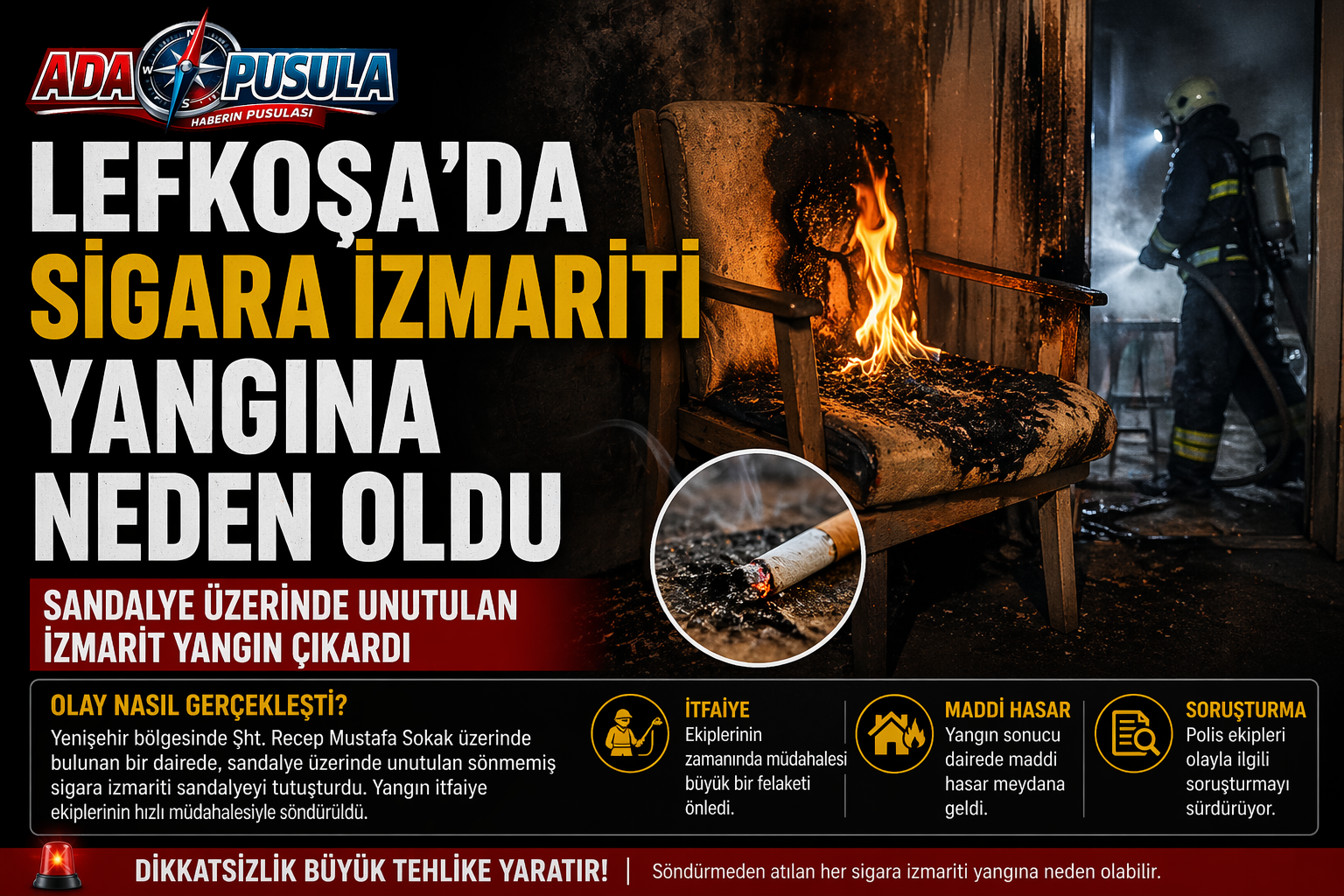 Lefkoşa’da bir dairede, sandalye üzerinde unutulan sönmemiş sigara izmaritinin neden olduğu yangın, itfaiye ekipleri tarafından söndürüldü.