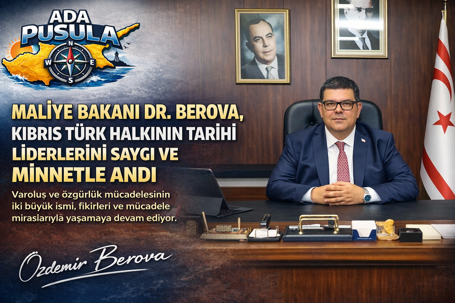 Maliye Bakanı Dr. Özdemir Berova, Kıbrıs Türk Halkı’nın varoluş ve özgürlük mücadelesine damga vuran iki tarihi lideri, Dr. Fazıl Küçük ile Rauf Raif Denktaş’ı vefat yıl dönümlerinde yayımladığı mesajlarla andı.