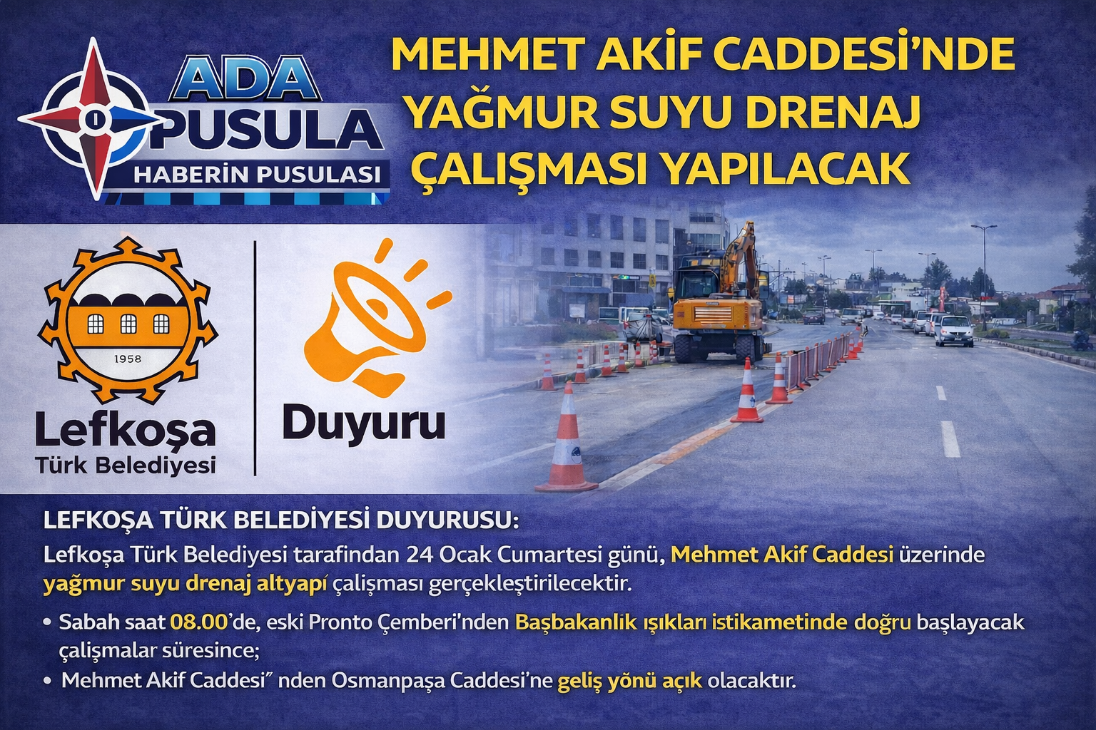 Lefkoşa Türk Belediyesi, 24 Ocak Cumartesi günü Lefkoşa’da Mehmet Akif Caddesi üzerinde yağmur suyu drenaj altyapı çalışması gerçekleştirileceğini duyurdu.