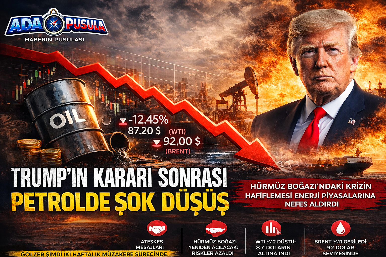 Ateşkes beklentisiyle birlikte petrol fiyatları sert şekilde geriledi. ABD ham petrolü (WTI), yaklaşık yüzde 12 değer kaybederek 87 doların altına indi. Türkiye’nin referans aldığı Brent petrol ise yüzde 11’e yakın düşüşle 92 dolar seviyesine çekildi.